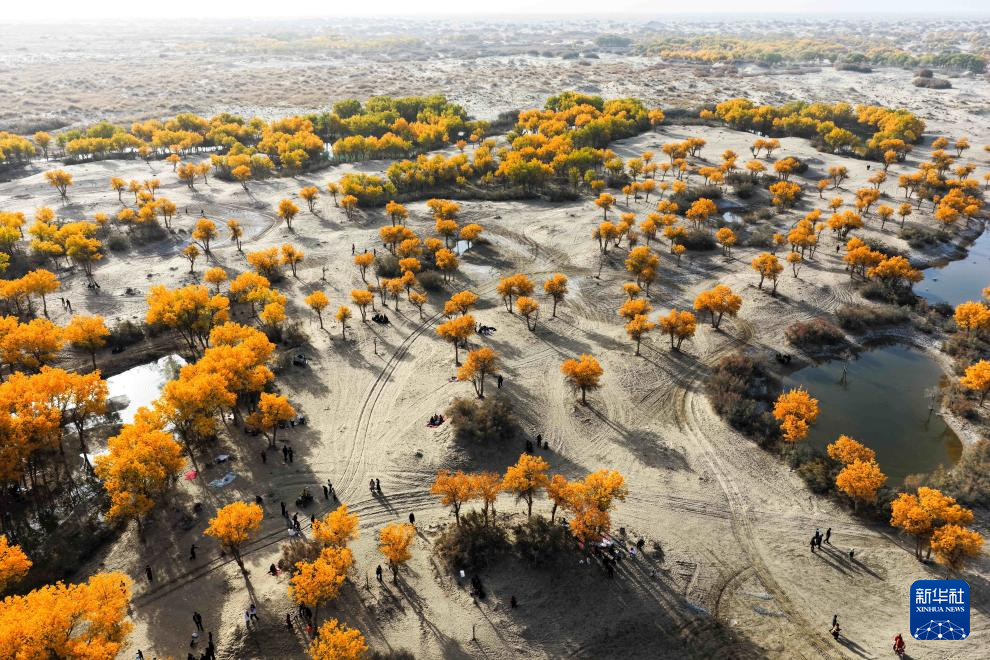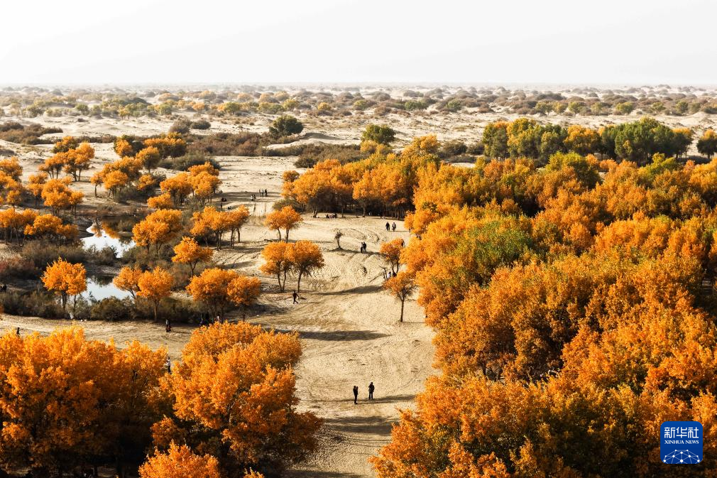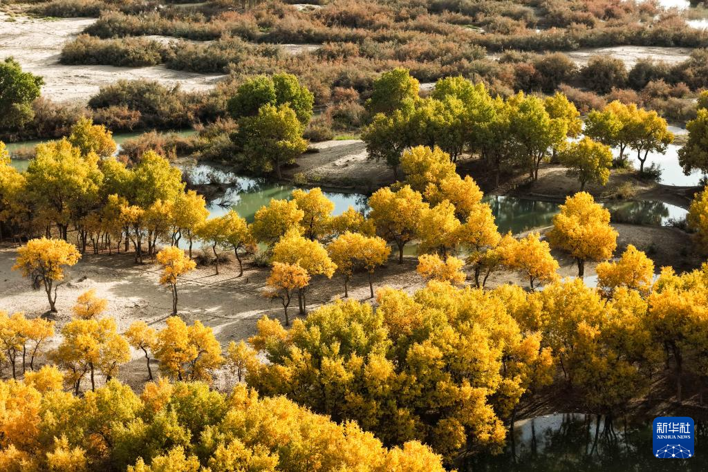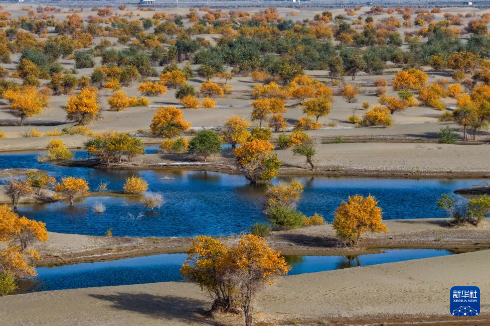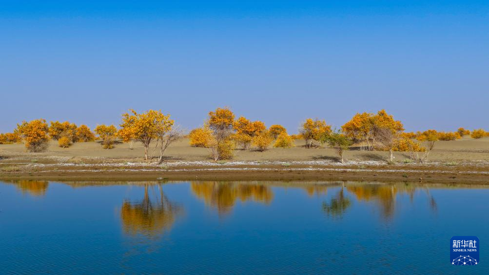 时下,新疆和田地区的胡杨迎来最佳观赏期,成片换妆的胡杨林与水天相映,共绘金秋美景。
