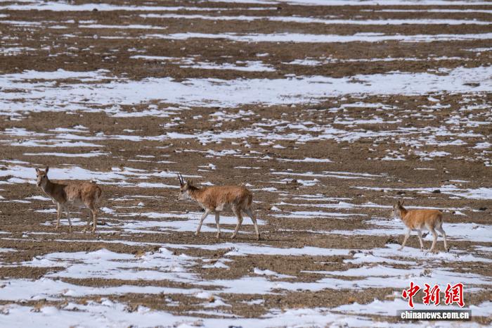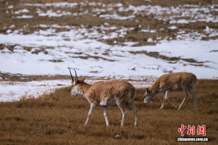 近日,中新网记者在西藏自治区阿里、那曲等地记录到藏羚羊群活动影像。画面中,藏羚羊群或低头觅食,或结伴而行,在高原的雪原与草原之间勾勒出和谐画卷。据悉,近年来,西藏藏羚羊种群规模一直持续扩大。2024年西藏自治区生态环境厅发布的《2023西藏自治区生态环境状况公报》显示,西藏境内藏羚羊数量增长到30多万只。图为10月9日,在西藏阿里地区拍摄到的藏羚羊群。江飞波 摄