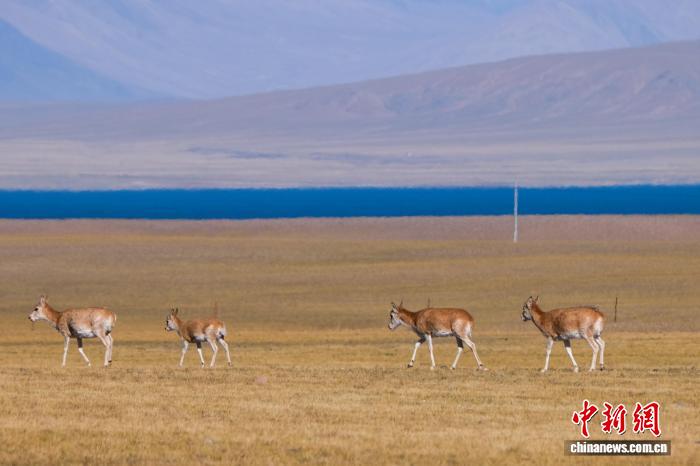 图为10月10日,藏羚羊群在西藏那曲市的高原湖畔悠闲觅食。江飞波摄