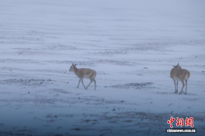 图为10月9日,在两只藏羚羊在雪原中觅食。江飞波摄