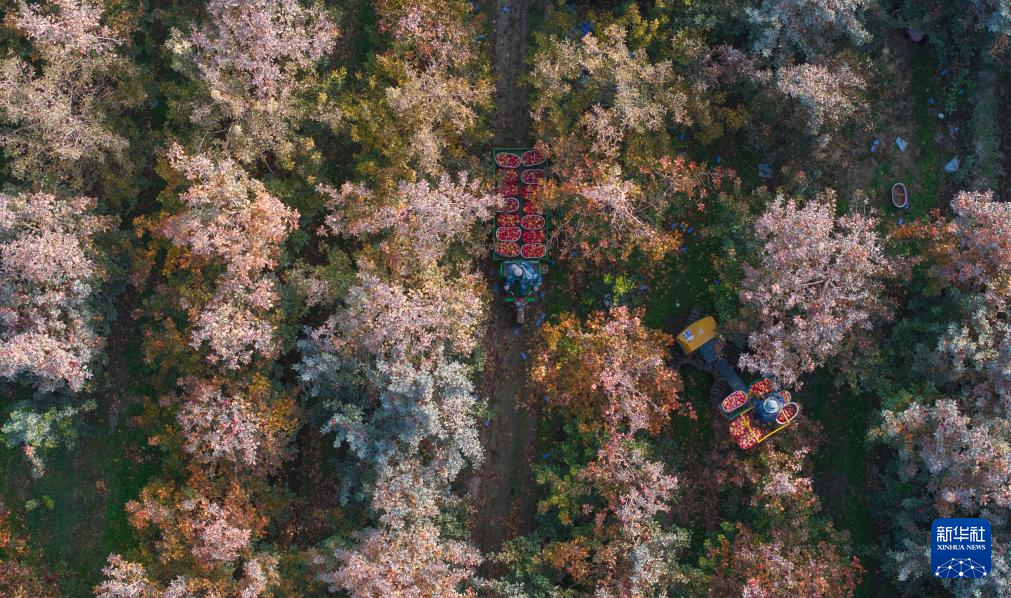10月23日,在新疆生产建设兵团第一师阿拉尔市六团三连苹果园,林果业服务队队员运输刚采摘的苹果(无人机照片)。