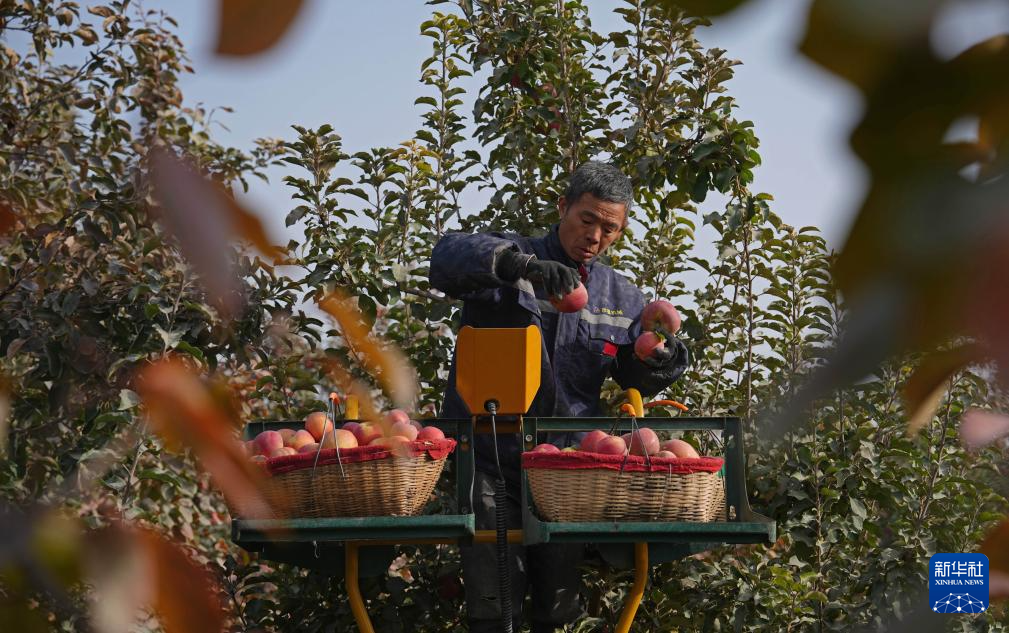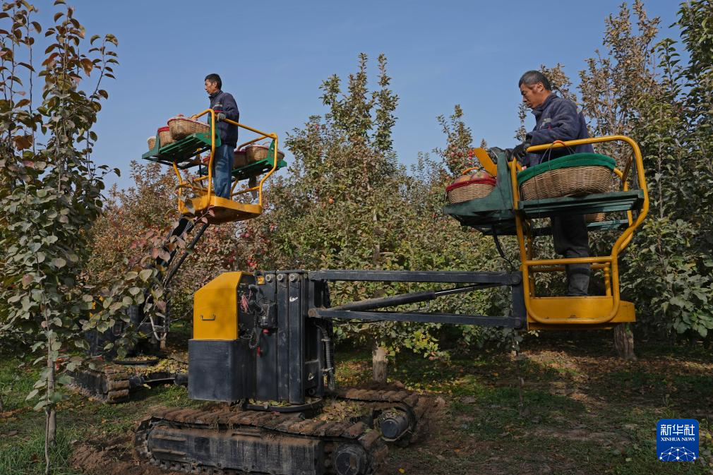 10月23日,在新疆生产建设兵团第一师阿拉尔市六团三连苹果园,林果业服务队队员乘坐智能采摘机采摘苹果。