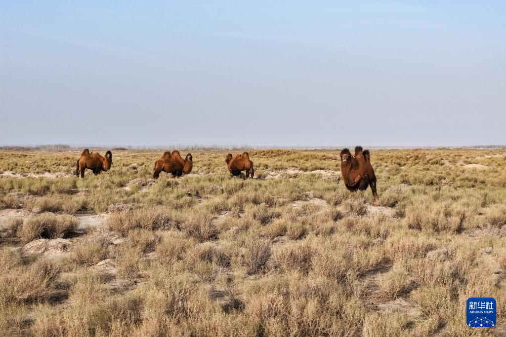 11月18日,一群骆驼在甘肃省瓜州县锁阳城镇的锁阳城遗址外活动觅食(无人机照片)。