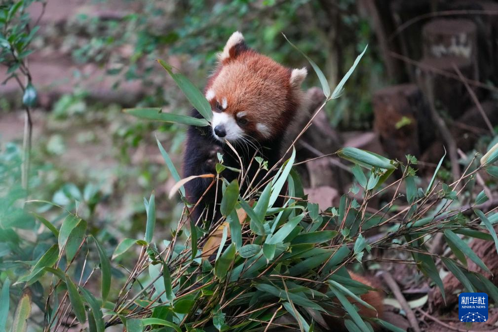 10月30日,在成都大熊猫繁育研究基地,一只小熊猫在吃竹叶。