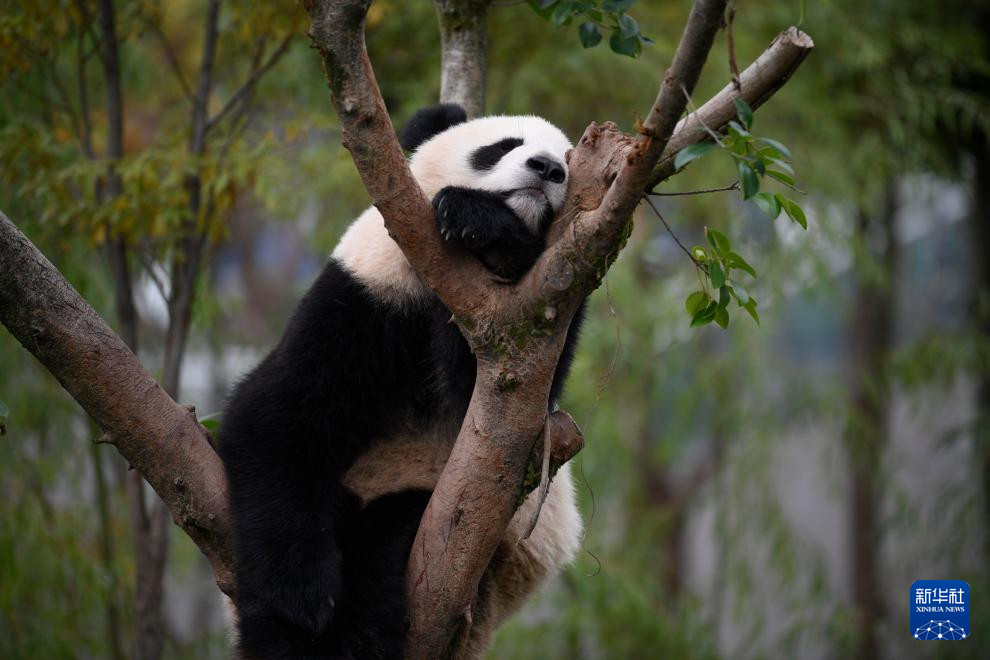 10月30日,在成都大熊猫繁育研究基地,一只大熊猫在树上休息。