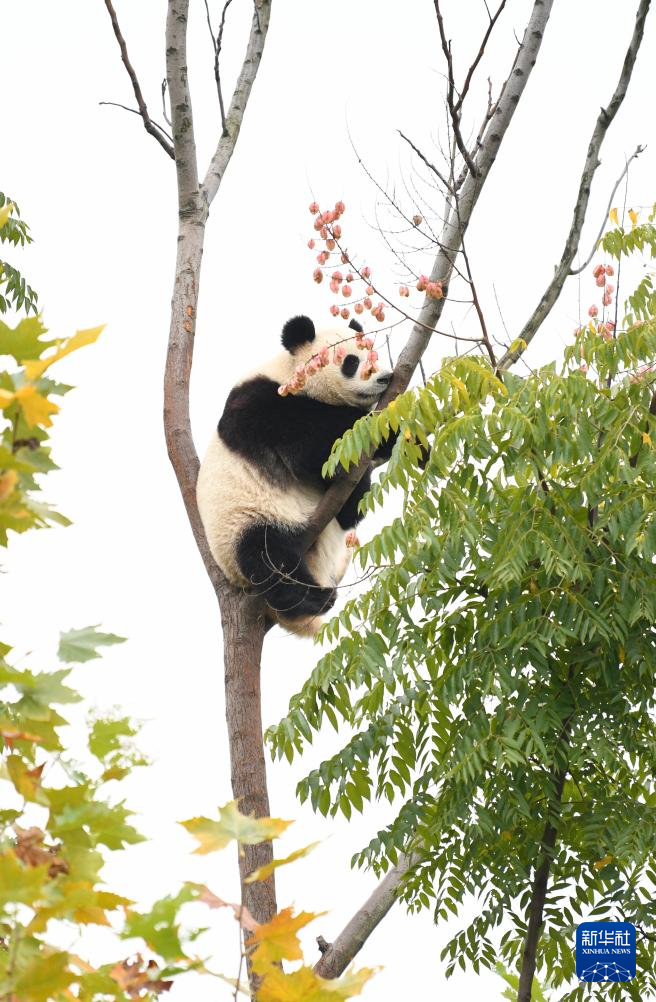 10月30日,在成都大熊猫繁育研究基地,一只大熊猫在树上玩耍。