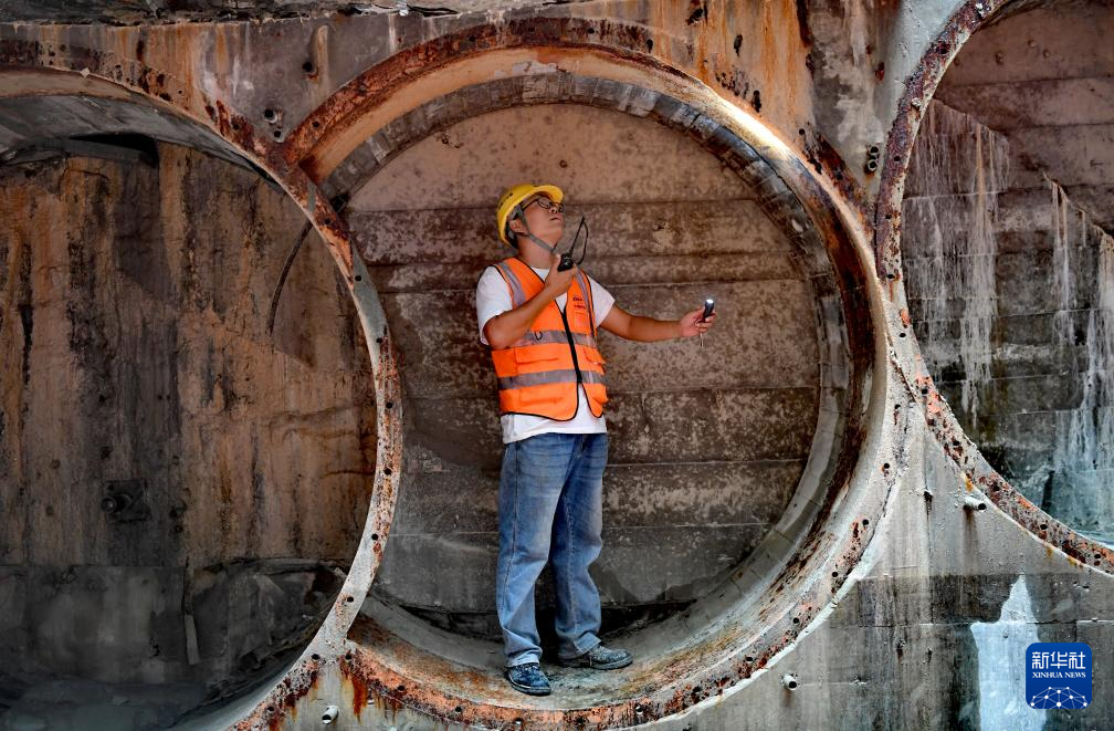 12月5日,工人在三亚河口通道工程项目现场检查贯通管相邻管节状态。