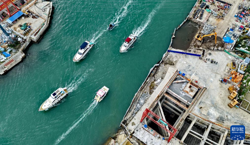 12月5日,游艇从三亚河口通道工程项目上驶过。