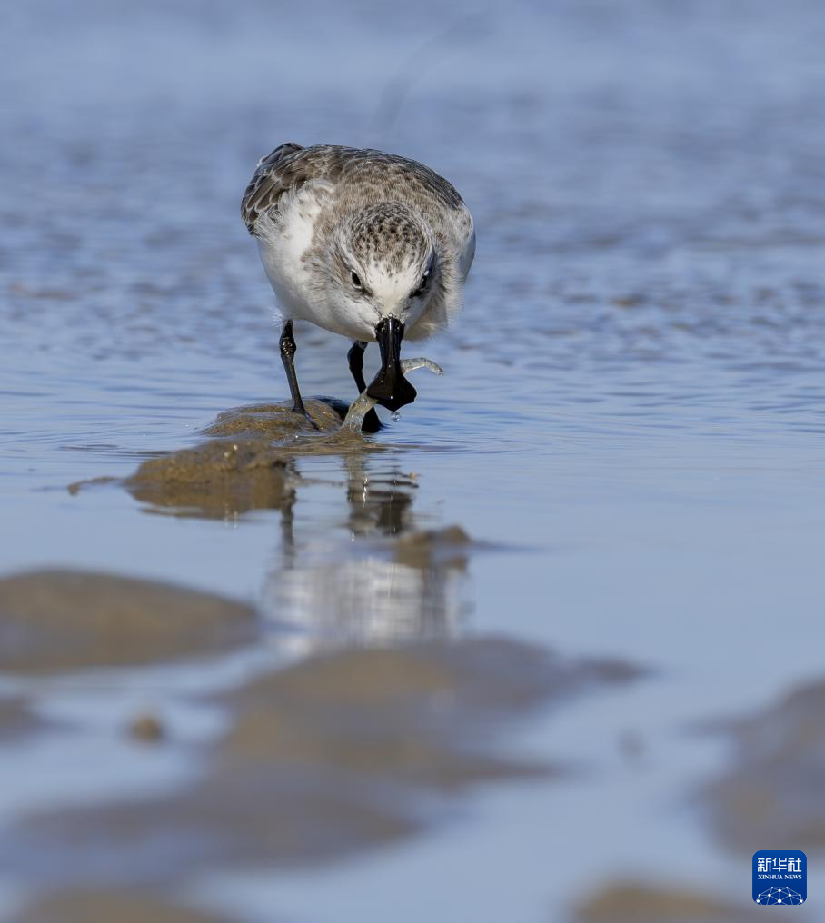 11月9日,一只勺嘴鹬在泉州围头湾滩涂上捕食海虾。