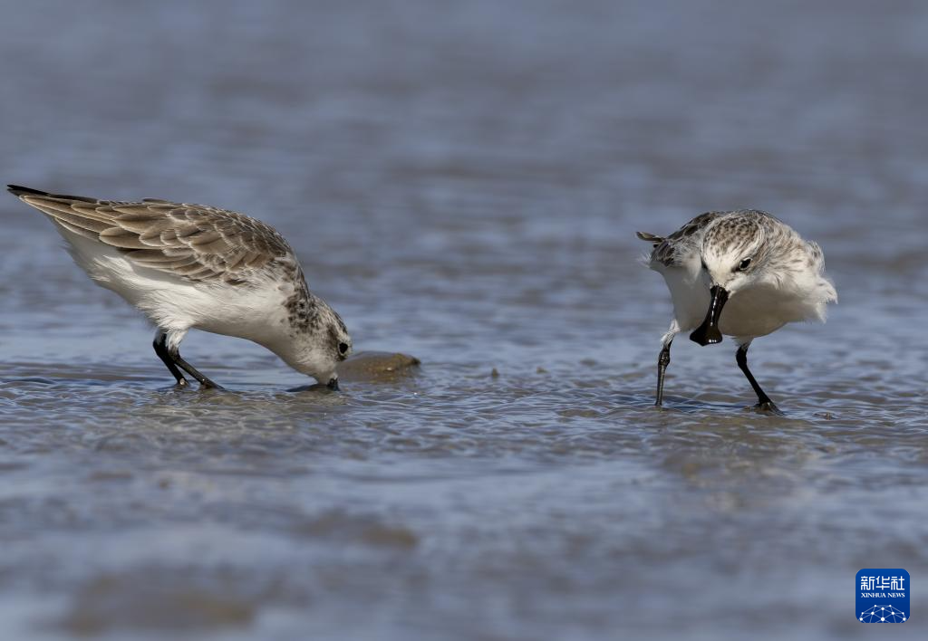 11月9日,两只勺嘴鹬在泉州围头湾滩涂上觅食。