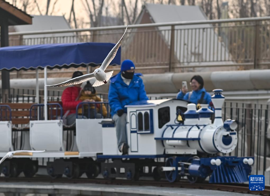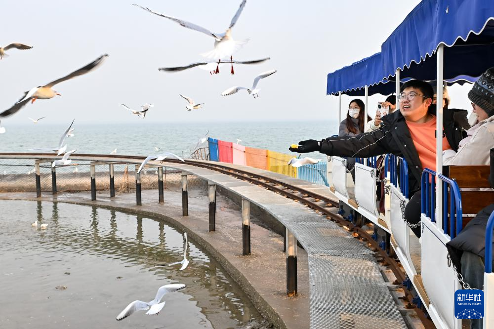 游人乘坐小火车喂食海鸥(12月10日摄)。