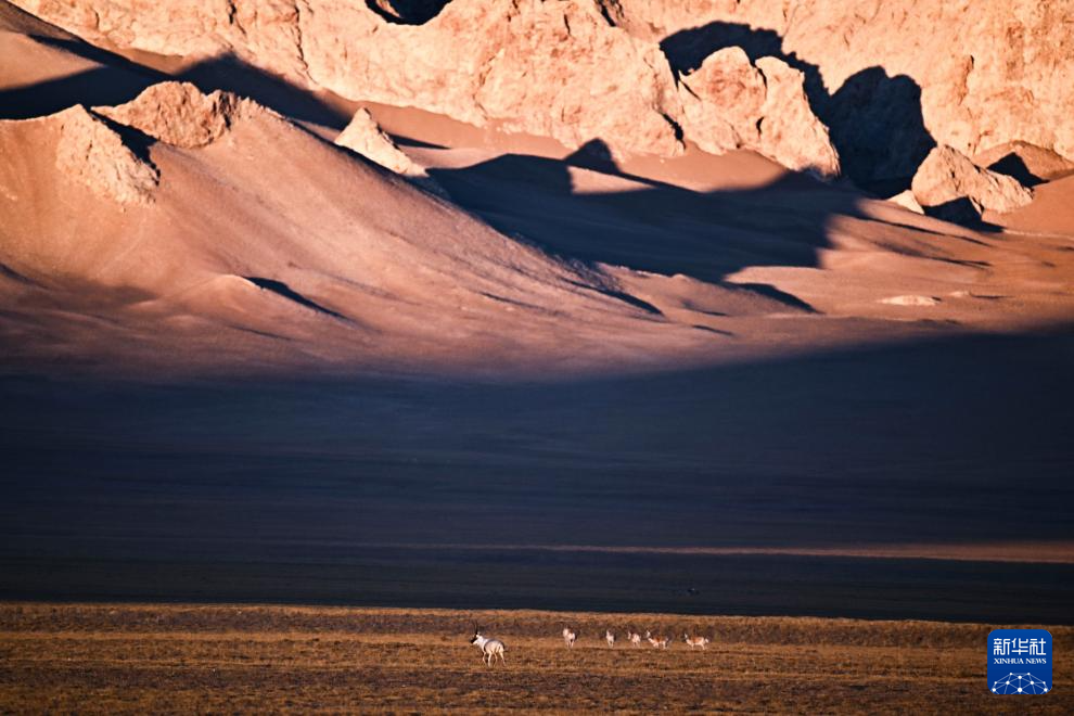 在阿尔金山国家级自然保护区,藏羚羊在狼牙山下的草原上觅食(12月6日摄)。