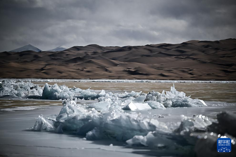 在阿尔金山国家级自然保护区,库木库里沙漠边的小沙子湖出现冰推景观(12月9日摄)。