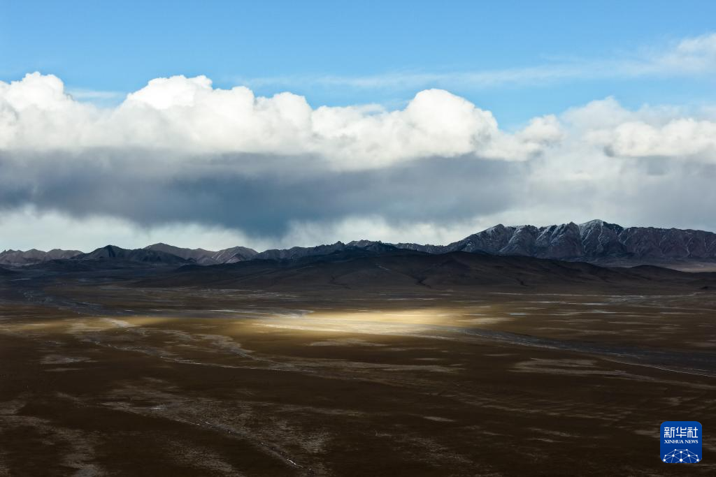在阿尔金山国家级自然保护区,阳光穿过云层照耀在阿尔喀山前的大地上(无人机照片,12月6日摄)。