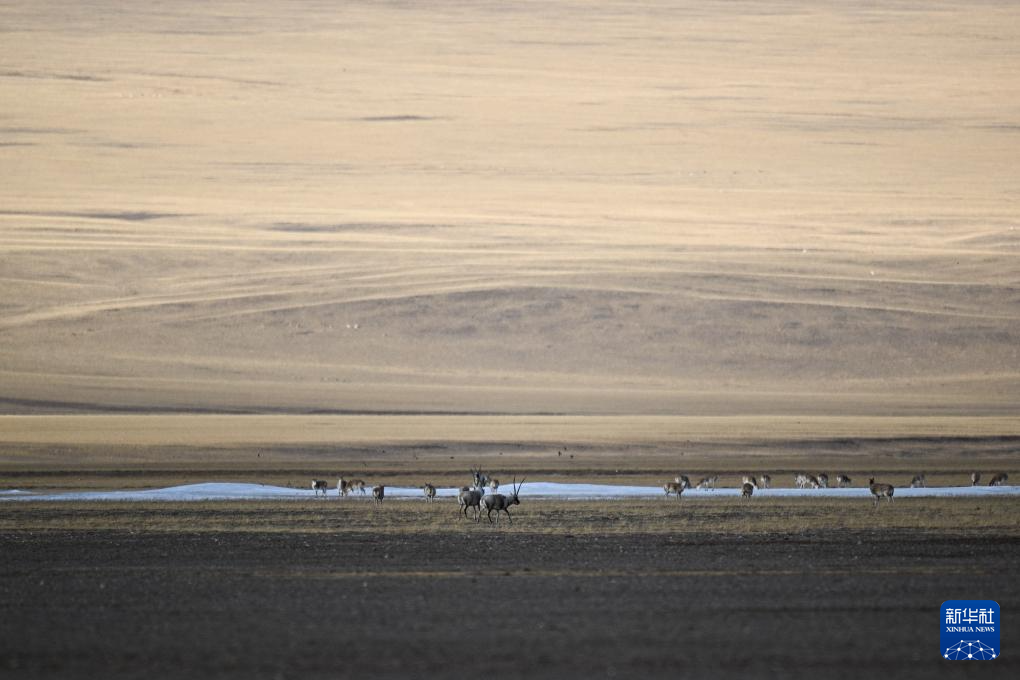 在阿尔金山国家级自然保护区,藏羚羊在草原上觅食(12月5日摄)。