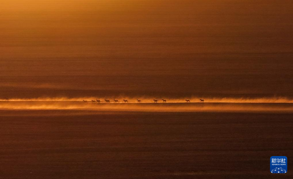 在阿尔金山国家级自然保护区,藏野驴奔跑在日出时的依协克帕提草原上(无人机照片,12月9日摄)。