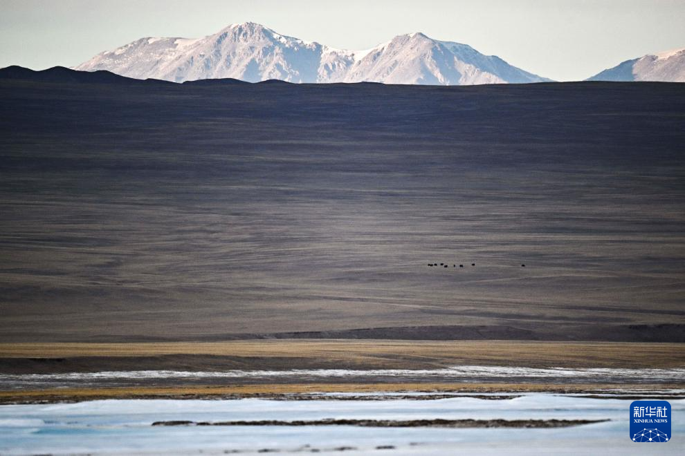 在阿尔金山国家级自然保护区,野牦牛在孟布拉克草原上觅食(12月7日摄)。