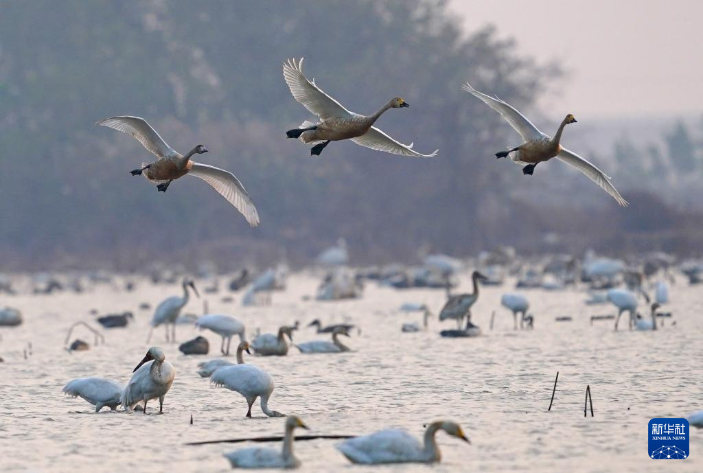 天鹅等候鸟在南昌五星白鹤保护小区内栖息飞翔(12月17日摄)。