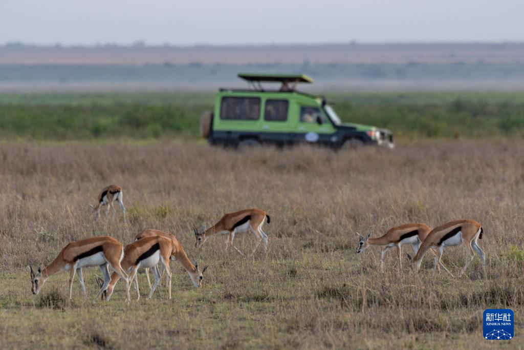 1月8日,游客在肯尼亚安博塞利国家公园乘车观看黑斑羚。