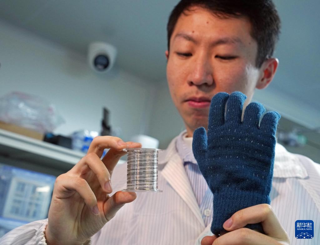 1月19日,研究人员展示成卷的“纤维芯片”(左)与织入“纤维芯片”可制成的智能触觉手套。