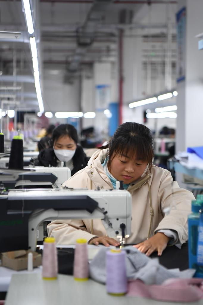 2月15日,工人在湖南省株洲市芦淞区的湖南欧微时尚集团生产服装。