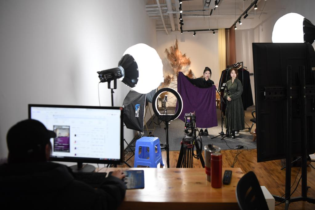 2月14日,主播在湖南省株洲市芦淞区的湖南素白服饰有限公司直播销售服装。