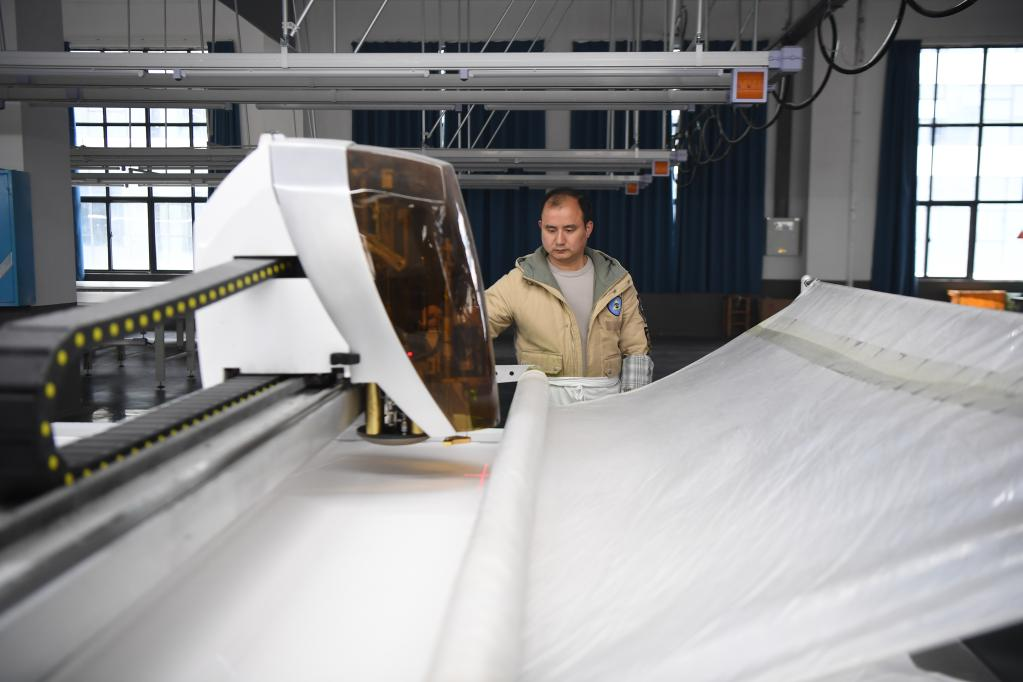 2月15日,工人在湖南尊睿服饰有限公司操作自动裁床,自动裁床可根据图纸精准裁剪布料。