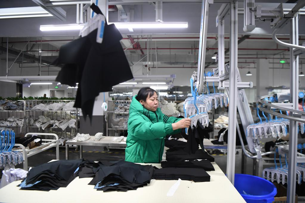 2月15日,工人在湖南尊睿服饰有限公司将裁片挂上自动吊挂系统。自动吊挂系统可自动将裁片送往下一道工序。