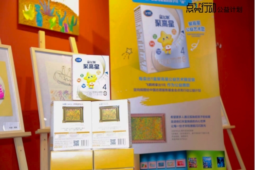 飞鹤与点亮行动公益计划携手推出的公益联名款“聚高星”,盒身印有青年孤独症画家王剑书的画作,让更多的人了解孤独症群体,看到孩子们的才华与潜能。在本次活动中,每卖出1盒聚高星公益艺术限定装,飞鹤就将拿出1元作为公益善款,定向捐赠给中国志愿服务基金会点亮行动公益计划,推动孩子们在教育、生活等方面的改善。