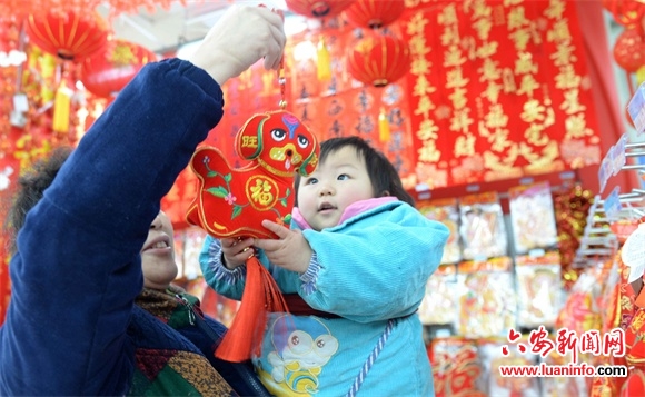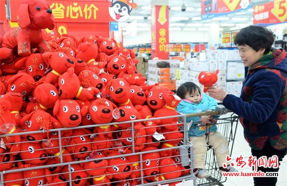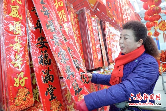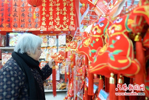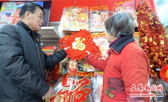 1月15日,在市区梅山路一家大型商场的超市里,市民正在挑选新年饰品。随着春节临近,市民们开始忙着选购春联、中国结、红灯笼等充满喜气的年货。在距离农历狗年春节还有一个多月的时间我市商家纷纷将中国结、对联、灯笼、生肖饰等极具喜庆色彩的装饰品搬进超市,一眼看过去尽是一片喜气洋洋的气氛,带来了浓浓的年味。( 记者王丽摄 )