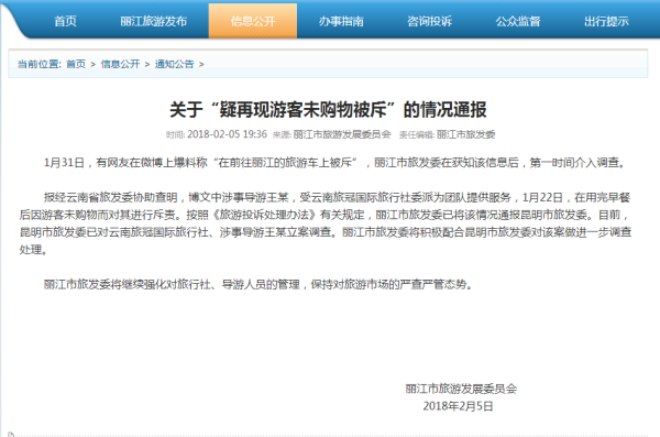 目前,昆明市旅发委已对云南旅冠国际旅行社、涉事导游王某立案调查。丽江市旅发委将积极配合昆明市旅发委对该案做进一步调查处理。