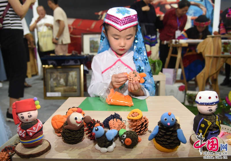 生态创新也为文化发展带来了新契机。在昆明馆寻甸展区,用核桃壳、瓜子壳、板栗壳、开心果壳、坚果壳等生活中的常见品和松果、大豆、大米、八角等天然元素,现场体验制作的DIY产品引人瞩目。据寻甸县文产办负责人陈平平介绍,此次参展寻甸县以“匠心一家人,守望初心魂”为主题,以现场布景的形式,带你走进一家人传承匠心的故事。以纺织刺绣品为主要元素,根雕木艺品、土陶工艺品、手工创意品为辅来展示文化产品。重点以精工演绎匠心自然的魅力,彰显寻甸生态+文化的力量。