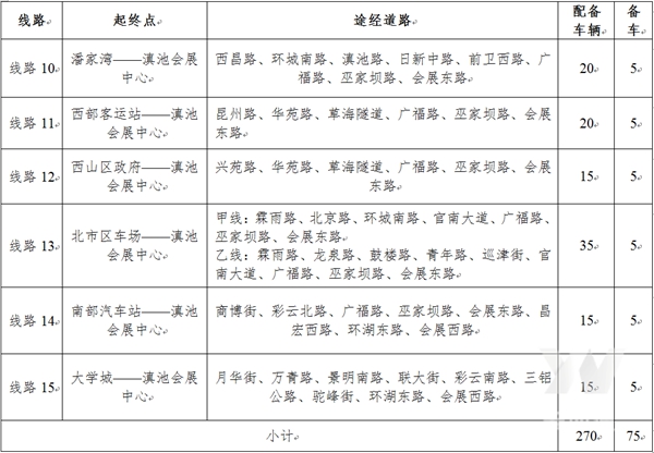 2.临时专线和定制车需按照营运车数的50%配备应急车辆,分别停放在滇池会展中心周边场地,如:滇池会展中心一号地块、半岛车场、海埂公园、前兴路公交枢纽站、世纪城、新螺蛳湾公交枢纽站等。