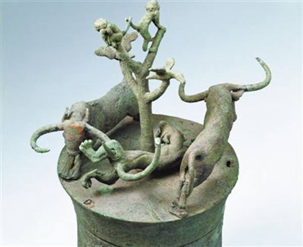 (图为晋宁石寨山出土的西汉时期的动物搏斗铜贮贝器)