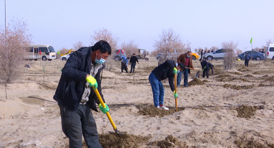 在各自的植树片区,干部群众分工协作,挖坑换土,扶树夯实、修枝定杆,涂漆压管等每一道工序都做得一丝不苟,在大家的共同努力下,一棵棵新栽种的苗木错落有致、迎风挺立,给这片昔日荒芜的沙漠带来生机。