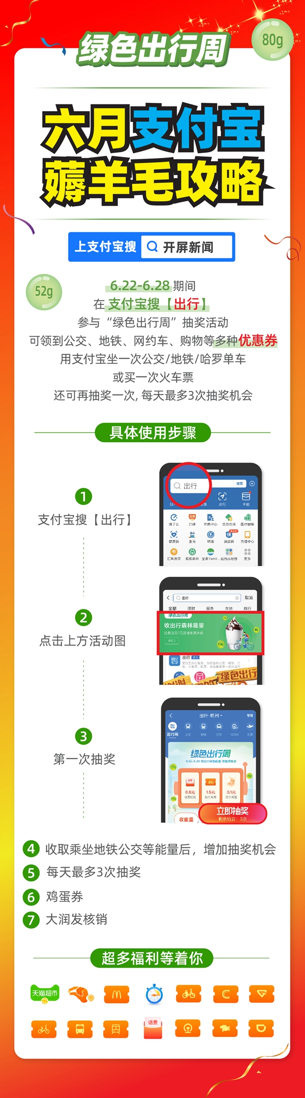 今年,联合国《生物多样性公约》第十五次缔约方大会(COP15)也将在云南昆明举行。为了倡导大家一起低碳环保生活,6月22日,支付宝联合昆明公交、地铁、哈啰共享等多家企业推出了“绿色出行周”活动。在活动期间,使用支付宝出行的昆明用户都有机会获得公交地铁乘车折扣、大润发0.1元4枚鸡蛋兑换券等多重福利,以此鼓励更多人选择低碳生活方式。