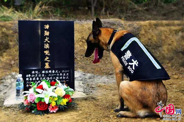当民警把“滨哒”装进墓穴,埋葬起来时,“鹰空”蹲坐在“滨哒”的墓碑前,一反往日的活泼的常态,默默的注视着墓碑上“滨哒”的名字,眼神深沉,像是对战友离去的不舍,又像是对缉毒战场“老前辈”崇敬,它想再多陪“滨哒”一会儿,迟迟不愿离开。