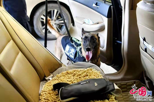 此时,姜定中想到了“鹰空”,便带着它对车辆进行检查。当嗅到车尾部的时候,“鹰空”做出趴下的警示动作。随后,执勤人员进行重点检查,当场在车体夹层中查获毒品可疑物净重2.69公斤,1名嫌疑人被民警当场控制。