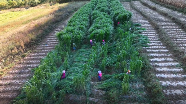 安南村村民李秀英说:“去年,我家种了二亩多,收入六七千左右,今天是种了四亩多收入一万多,对我们老百姓好,我们青储饲料收了以后又让我们来这里打工,一天200元,我们远处也不用去打工。”