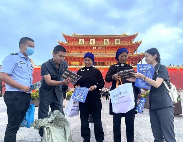 建水县朝阳楼下,几名建水县人民法院青年干警正向群众发放各类反诈宣传材料,提醒老年人提防养生保健、投资理财、赠送礼品、低价旅游等常见的诈骗手段,切实增强法治意识和防骗识骗能力。在6月13日至17日开展的这期“打击整治养老诈骗专项行动宣传周”活动中,建水县法院干警深入广场、公园、超市、菜市场等人群密集场所深入开展专题宣传,营造出新一轮打击整治养老诈骗的宣传热潮。