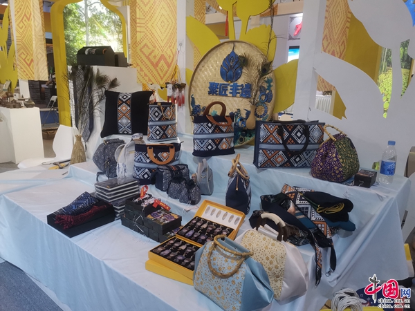 此外,乌铜走银茶壶、易门浦贝陶器、白族扎染手包等琳琅满目的非遗商品陈列在两旁,展台还贴心设置了各非遗项目的介绍标牌,让游客在购买商品的同时还可以了解到云南各项非遗的来源、保护和传承情况。