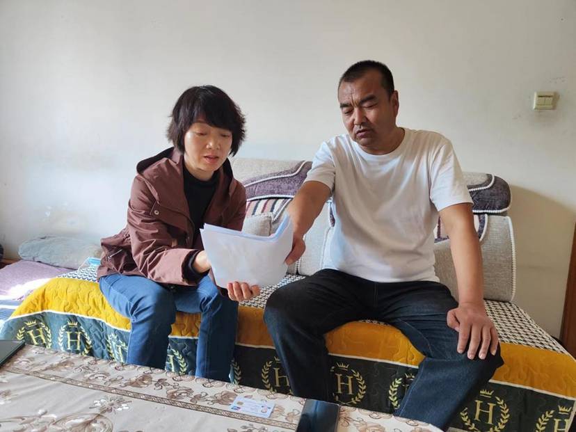 昌吉市医保局工作人员根据救助政策和标准,上门为吴英杰(右一)落实医疗救助待遇,并及时将4.9万元救助金送到他家。阿依加玛丽•列提甫摄