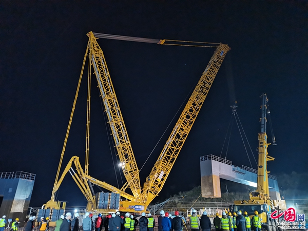 钢盖梁吊装在既有运营的沪昆高铁上方,施工作业必须在夜间高铁动车停轮,封锁线路后方可进行。为确保钢盖梁起吊施工安全,国铁昆明局滇中铁路建设指挥部牵头组织施工、设计等单位多次开展安全风险研判、设计优化和技术交底,最终决定采用800吨履带吊起钢盖梁,逆时针旋转125度后与门式墩精准对位的方案。