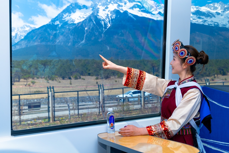 丽江新开通的全球首列全景观光山地旅游列车,串联白沙古镇、玉水寨、甘海子等景点。列车配备1.9米电动变色观景窗,可抵御高原紫外线,沿途将雪山、草甸、花海尽收眼底。单程票价50元,往返80元,每日最小发车间隔12分钟,35分钟即可从古城直达玉龙雪山。