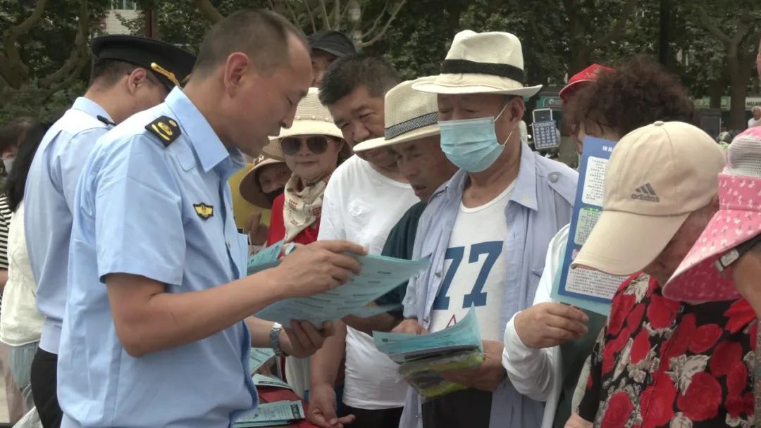 工作人员正在向过往群众发放宣传资料,并讲解日常生活中需注意的安全常识。文琳娜摄