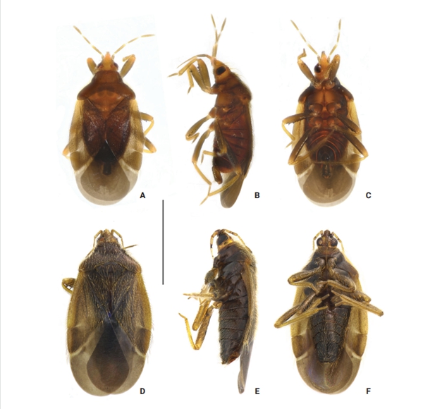 据了解,丝蝽科昆虫是一类习性独特的罕见蝽类昆虫,高度依赖丝质环境生活,多栖息在蜘蛛网或纺足目昆虫(足丝蚁)的网上。全球共记录9属23种。我国此前仅有2种记录。