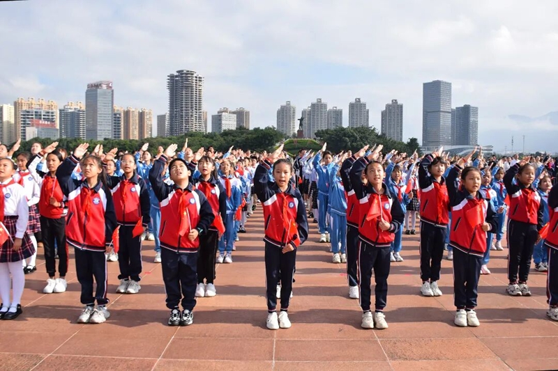 玉溪市在聂耳广场举行纪念抗战胜利80周年,中小学师生同升国旗、同唱国歌活动,开启新学年第一课。