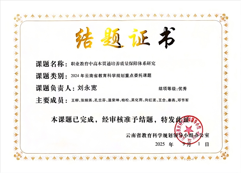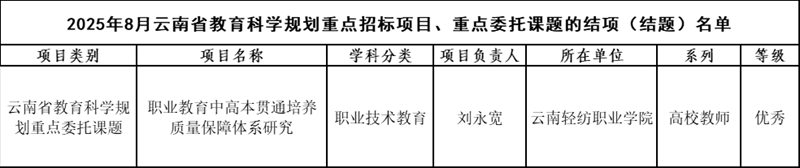 近日,由云南轻纺职业学院校长刘永宽教授主持的云南省教育科学规划重点委托课题《职业教育中高本贯通培养质量保障体系研究》,经专家组评审顺利结题,并获评“优秀”等级。该课题成果为云南省职业教育“中高本”贯通人才培养提供了理论依据和实践路径。