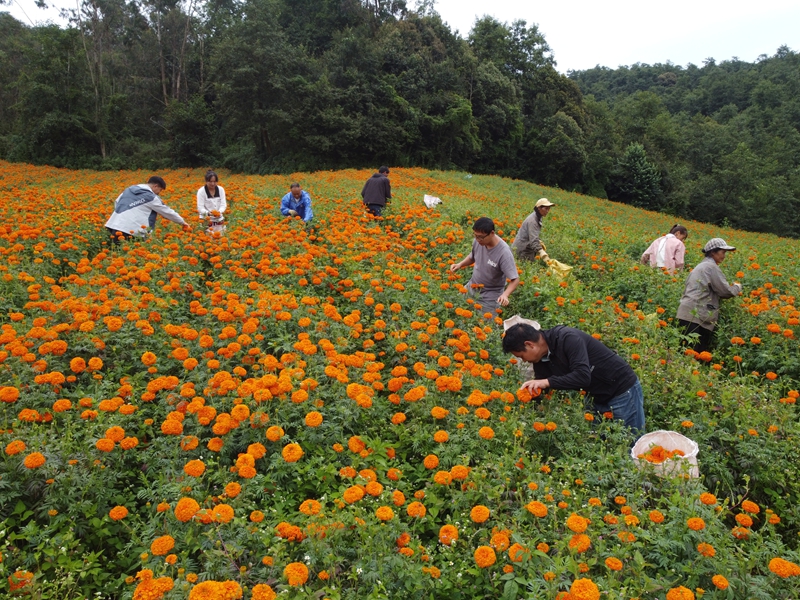 这几天,万寿菊也到了盛花期与采摘期,走进双柏县法脿镇月牙埂水库,数十亩金黄的万寿菊汇成壮观花海,花海中间,村民们欢声笑语采摘饱满花朵,丰收喜悦在花香中飘荡。万寿菊经济价值高,是双柏县重点发展的阳光产业,万寿菊周期短、效益好,劳动强度老人妇女都适宜。年内,双柏县种植万寿菊12450亩,预计鲜花总产量4.4万吨,预估产值4793万元,真正成为群众家门口的“致富花”。今年61岁的张秀英就在家门口找到了工作,她满意地说:“没想到我这个年纪还能在家门口务工,这里活计轻巧,工资每天100元,我这个年纪工资是算高的了,还离家近,我干着也开心。”