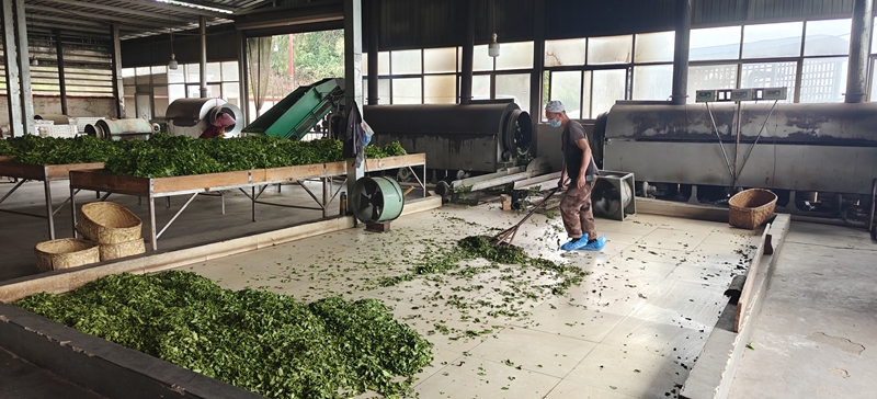 在白竹山脚下的茶叶加工厂也是一派忙碌景象,工人们正将当天采摘的鲜叶进行机械杀青、揉捻、烘干,每道工序紧张有序,加工厂的工人都是附近的村民。这是双柏县依托茶叶加工厂,把务工车间建到群众家门口的新就业模式,这样,农闲时节,群众也能靠务工获得可观的收入。法脿镇烂泥村委会烂泥村村民姚立相介绍道:“我的主要工作就是加工春茶和秋茶,我妻子负责采茶,我们夫妻俩一年在这里的务工收入有四万多元,闲时还能管管家里,有这样一份工作我们很知足。”
